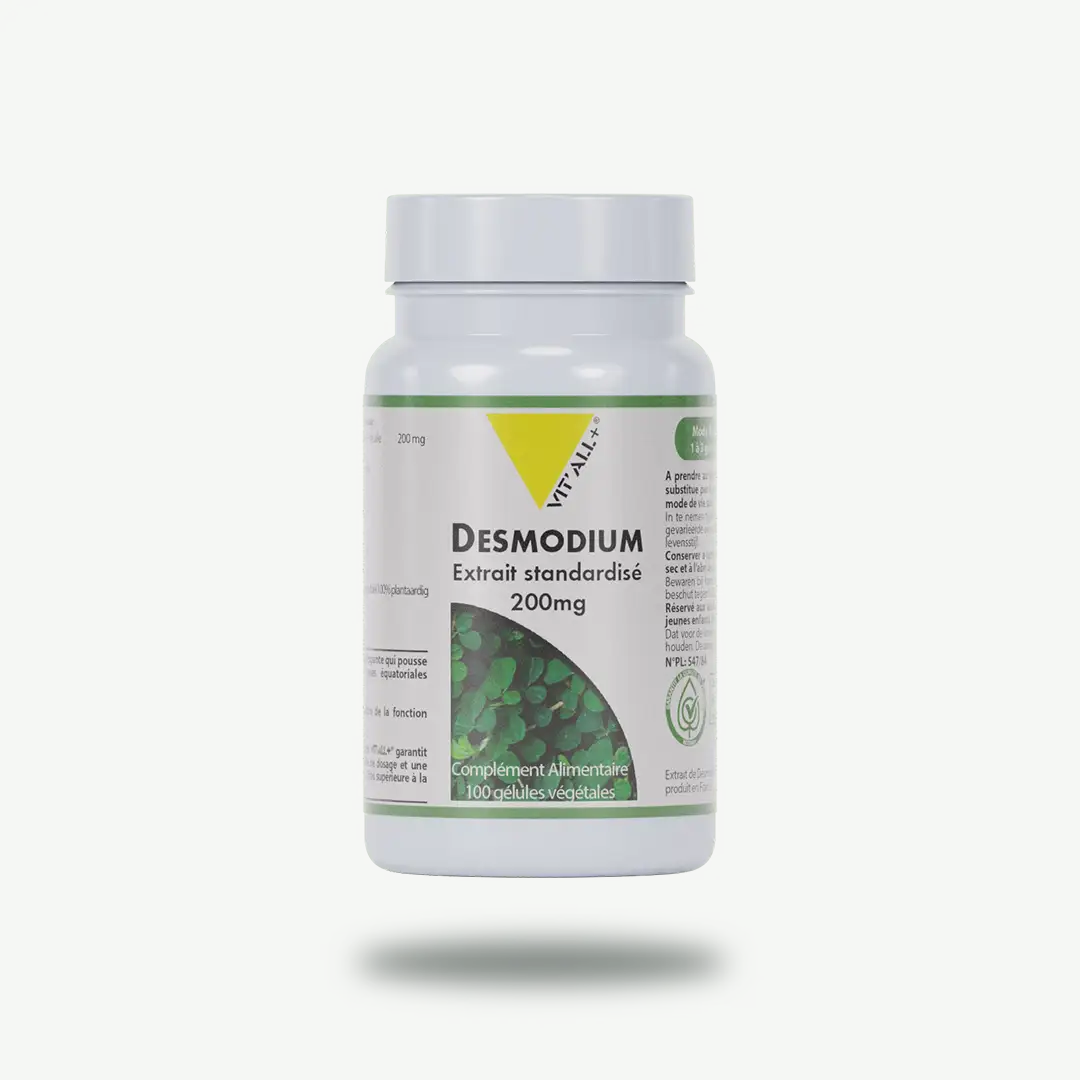 L’Extrait Standardisé de Desmodium VIT’ALL+® garantit une pureté optimale, une stabilité de dosage et une concentration en principes actifs 2 fois supérieure à la poudre de plante. Chaque gélule équivaut à 400mg de plante sèche.